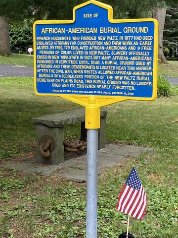 This story came back to me this morning as I took my walk along Huguenot St. in New Paltz, NY: the sign at the African American burial ground has been repainted. It is now brighter and more noticeable. It sits in front of a "monument" of stone, a bench with a thick iron chain at its base. The bench has been there a while, now the sign stands in high relief, the story of enslavement by the Huguenot, English and Dutch settlers in New Paltz crushed into a small space, there for all to read and ponder, and for the descendants of slaves to visit as a sacred space. My only quibble is that the word "founded" was not changed as the land we live on was inhabited by the Lenape Nation before the settlers arrived, and was stolen from them.