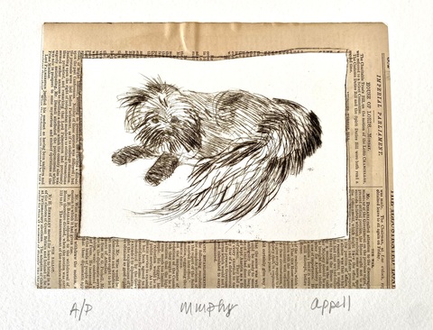 I am channeling Jenny Holzer this morning, among other artists I have known and loved. "I want to tell you what I know," she wrote on one of her projected wall pieces, "in case it is of use." And what a visual artist knows is usually expressed without words, or in combination with words in a collage. Linda Appell uses cut or torn fragments of old newspapers to create frames around, or within, her dry point prints. In the image I have chosen to illustrate this blog post, the evocation of a human's loving attachment to a dog is calmly settled in its historic framing, complete and entire.