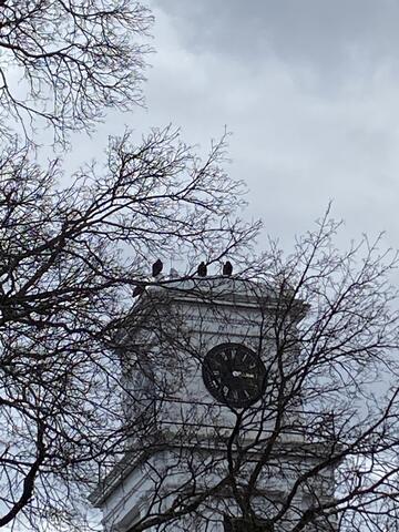 A flock of black vultures on the clock tower of the Dutch Reformed Church on Historic Huguenot Street, New Paltz, NY.